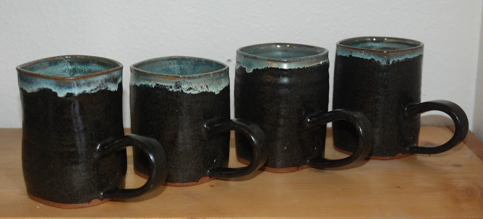 To accompany the new year and new clay, I also made a new stamp: a stylized combination of Siberian and Japanese irises that I hope will look nice under glaze. I plan to replace writing my name or initials with my stamp--except for the Corral mugs, below, which I've already stamped the side of, and I don't want to overcrowd. This new clay body has a lovely color when fired, and I'd rather leave the bottoms of my pieces simple. The stamp is hand drawn, so that it has a uniqueness of a signature, but it allows me to express something other than just my name. At a workshop by Takashi Nakazato a few years ago, I was surprised to learn that the mark he makes isn't related to his name; it means "money" or "sell" or something like that. He is a businessman besides being an artist, and truly intends to for his work to be purchased.